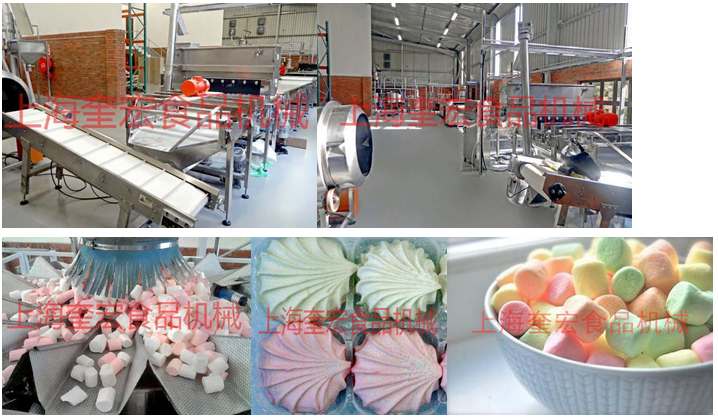 連續(xù)式棉花糖生產(chǎn)線可以生產(chǎn)不同形狀和顏色的擠出成型棉花糖產(chǎn)品,也可生產(chǎn)果醬夾心的澆注成型棉花糖產(chǎn)品。